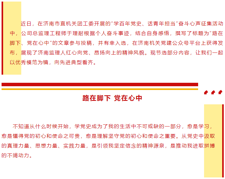 济南监理总监理工程师于理耐奋斗事迹获市直机关团工委“学百年党史 话青年担当”奋斗心声活动展播