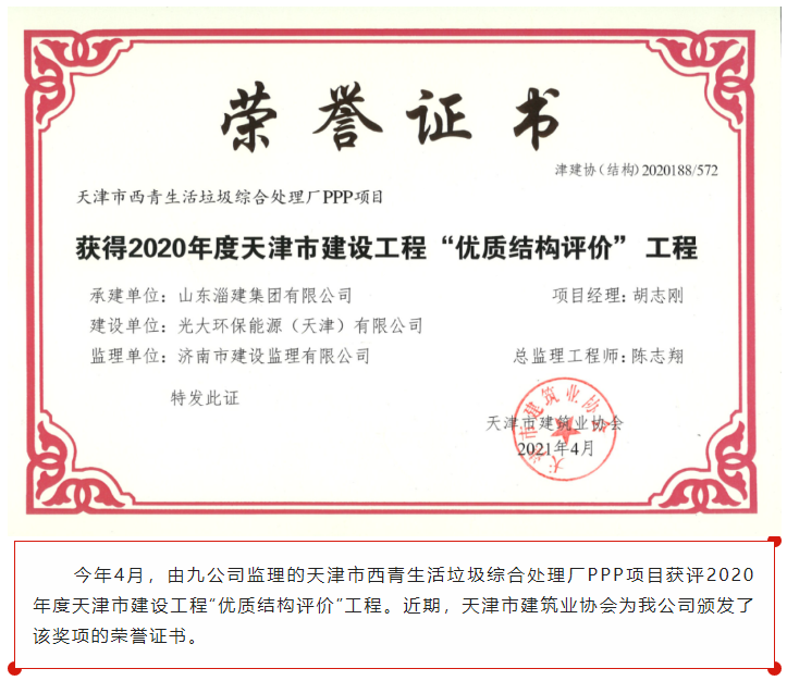 济南监理天津市西青生活垃圾综合处理厂PPP项目获评2020年度天津市建设工程“优质结构评价”工程