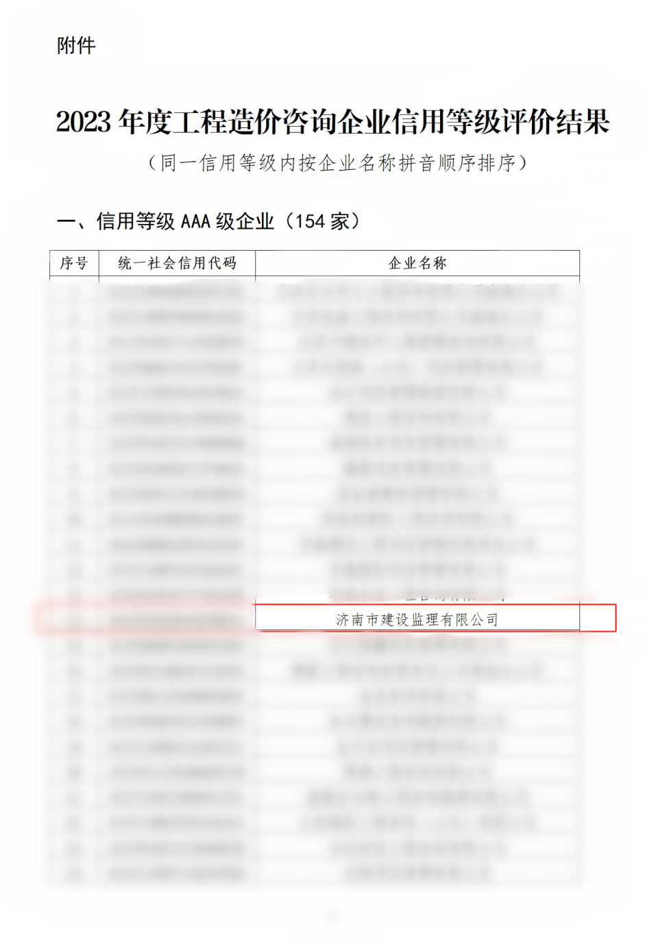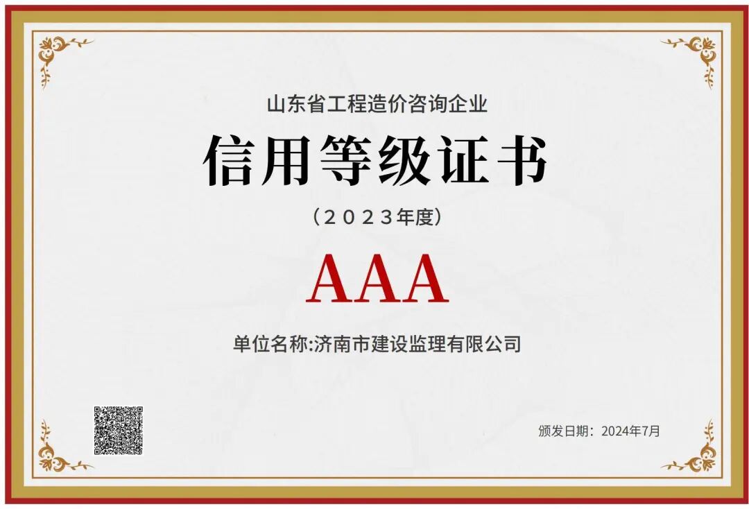 喜报!济南监理获评2023年度星空web版登录入口省工程造价咨询企业信用等级评价AAA等级