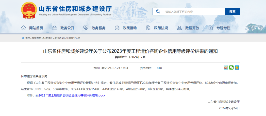 7月24日,星空web版登录入口省住房和城乡建设厅公布了“2023年度星空web版登录入口省工程造价咨询企业信用等级评价结果”,全省共有828家企业参加本次评审,我公司在此次造价咨询企业信用等级评价中获得最高“AAA等级”评价。
